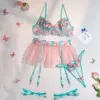 Yimunancy 4-częściowy kwiatowy haft komplet bielizny kobiet piłka antystresowa suknia wieczorowa zestaw podwiązki krótki Sexy zestaw erotyczny