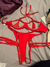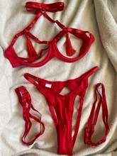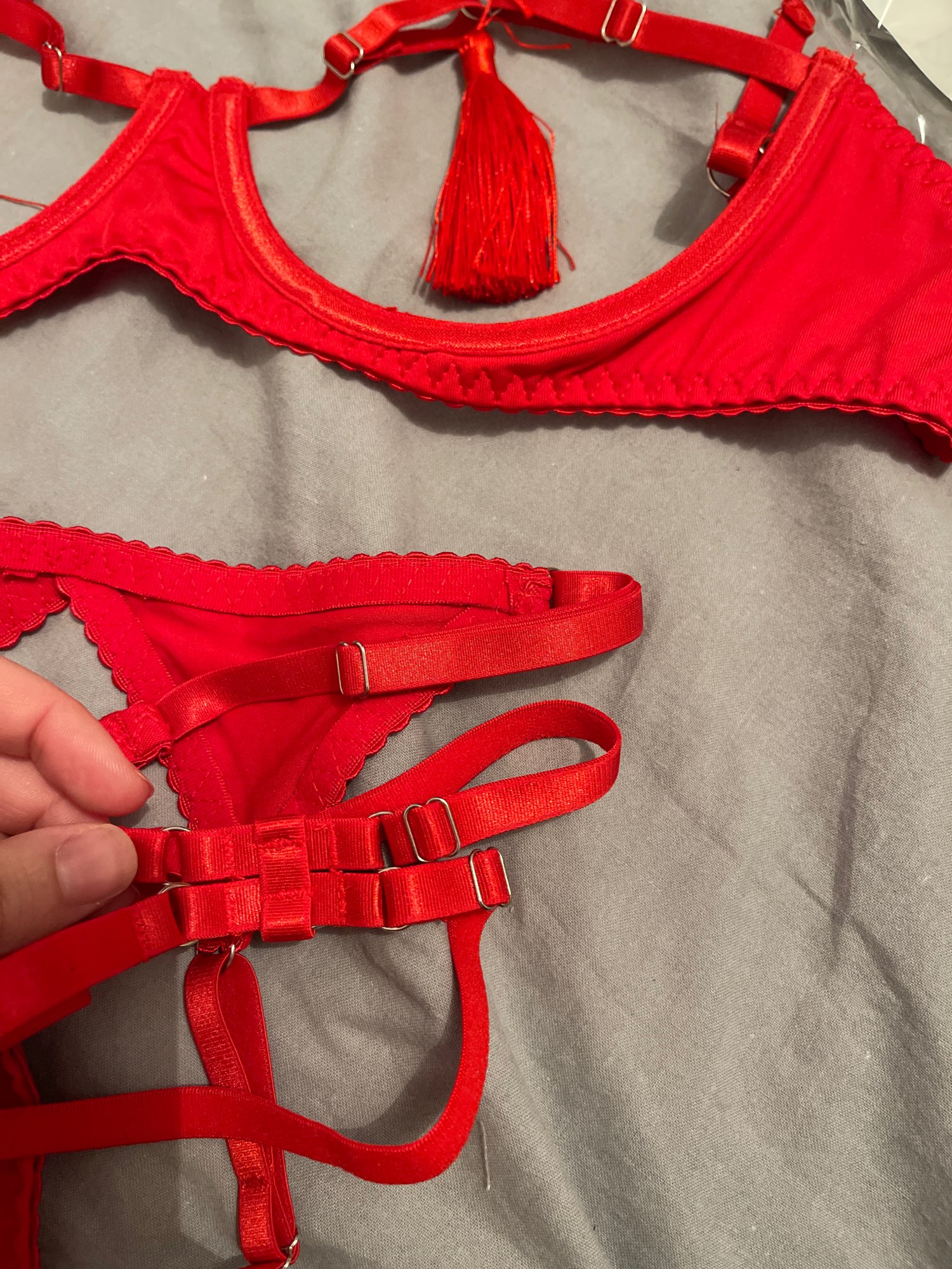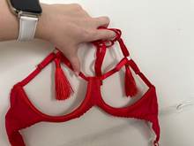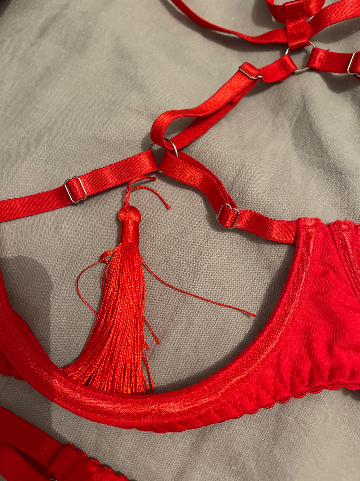 Komplet bielizny damskiej Ruby to kwintesencja zmysłowości i wyrafinowanego stylu, dostępny w uwodzicielskiej czerwieni oraz klasycznej czerni. W skład zestawu wchodzi odważny biustonosz z wycięciami, zapinany na szyi, który pięknie podkreśla linię dekoltu, dodając całości drapieżnego charakteru. Ozdobne elementy na piersiach przyciągają spojrzenia, nadając bieliźnie unikalnego wyglądu i elegancji. Komplet uzupełniają seksowne majtki, które doskonale komponują się z podwiązkami, podkreślając smukłość nóg.