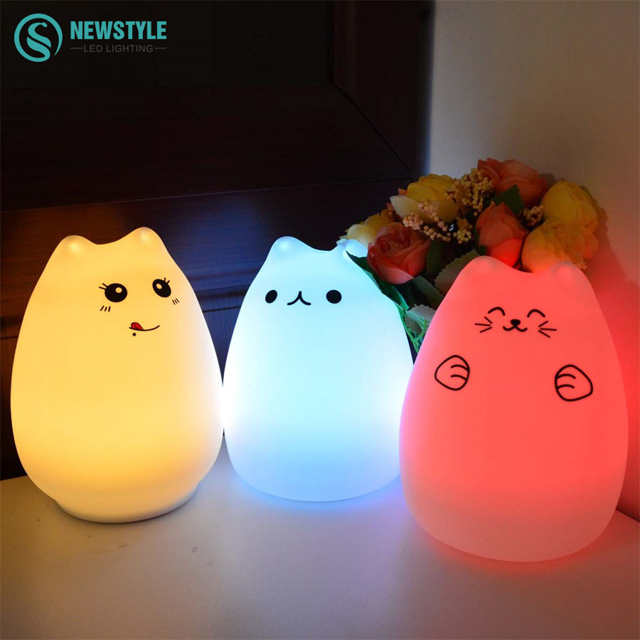 Lampka nocna LED ze zmiennymi siedmioma kolorami, zasilana bateriami AA lub na kabel USB.
